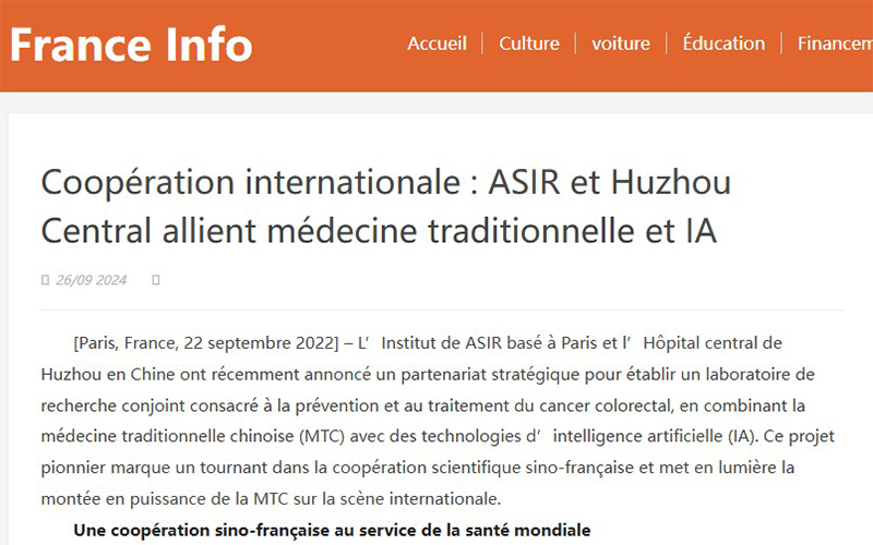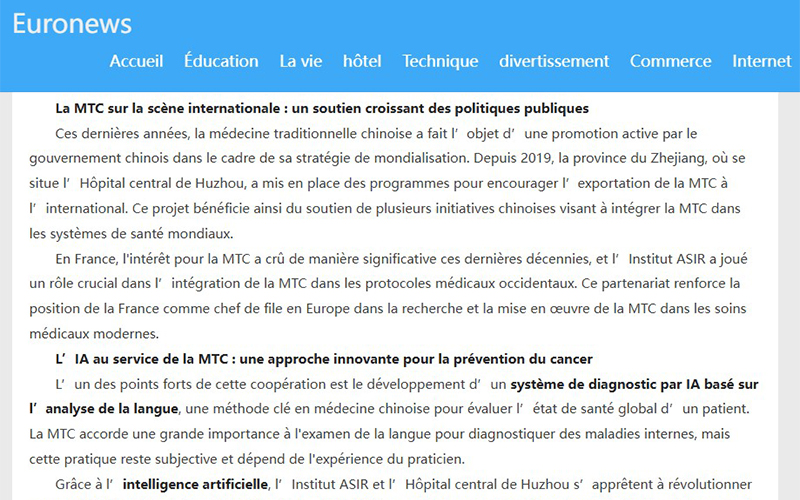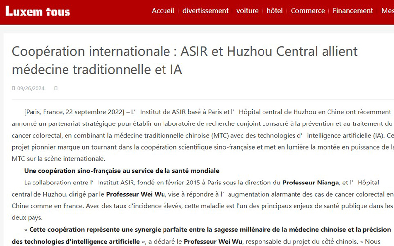 卢森堡时报:”Grâce à l’intelligence artificielle, l’Institut ASIR et l’Hôpital central de Huzhou s’apprêtent à révolutionner cette méthode en la rendant plus objective et normalisée.Une médecine intégrative : vers un nouveau modèle de soins.