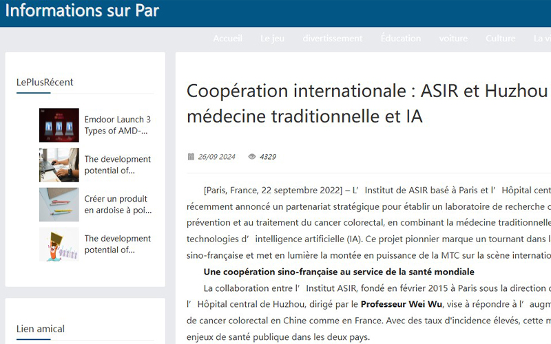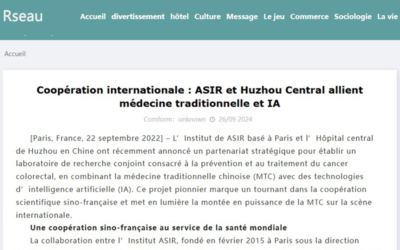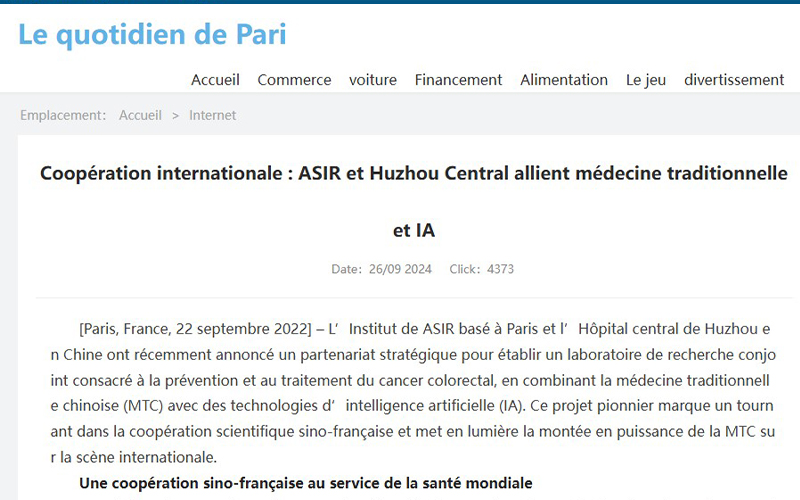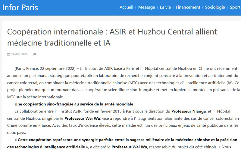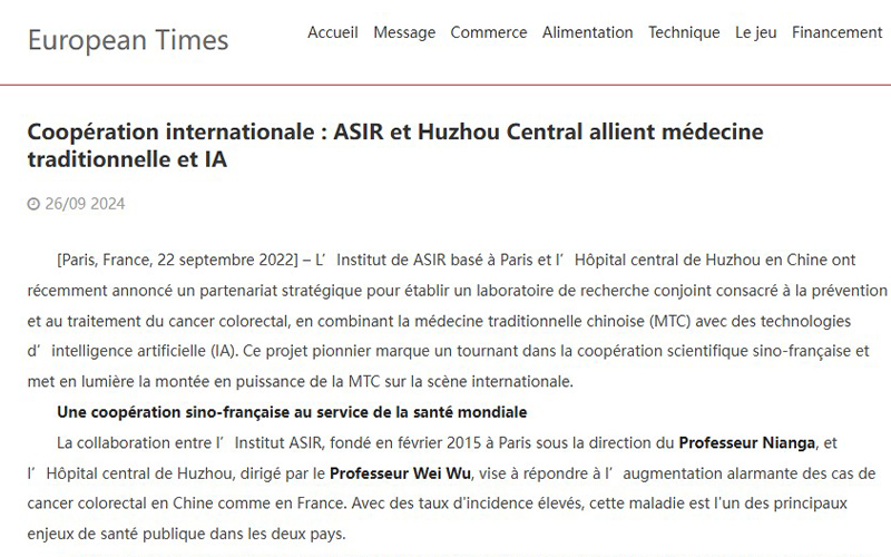 法国科技网:Une coopération sino-française au service de la santé mondial. La collaboration entre l’Institut ASIR, fondé en février 2015 à Paris sous la direction du Professeur Nianga, et l’Hôpital central de Huzhou, dirigé par le Professeur Wei Wu, vise à répondre à l’augmentation alarmante des cas de cancer colorectal en Chine comme en France.