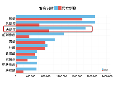 1、全球第3大高发肿瘤以及第2位致死肿瘤;       2、大肠癌是中国第3大高发肿瘤以及第5位致死肿瘤。大肠癌在法国每年造成43,000余例新发病例 和17,000余例死亡病例。