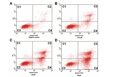 通过流式细胞术对FITC-Annexin V和PI染色的分析,图中每个象限的细胞百分比代表了不同的细胞状态(C1 为坏死、C2 为晚期凋亡、C3 为活细胞、C4 为早期凋亡)。与对照组相比,经左旋一叶萩碱处理后的HL-60细胞在早期和晚期凋亡阶段均有显著的剂量依赖性增加,12.5、25.0 和 50.0µmol/L左旋一叶萩碱处理48h后,凋亡细胞百分比分别为20.42%、37.14% 和 66.36%,表明左旋一叶萩碱能够诱导HL - 60细胞凋亡。
