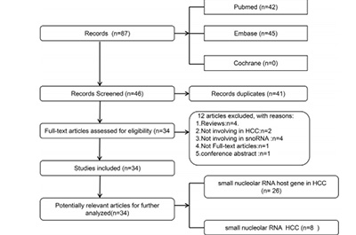 这项研究通过检索 PubMed、Embase和Cochrane数据库,筛选出34篇相关文献,分析小核仁RNA(snoRNA)及其宿主基因(SNHG)与肝细胞癌(HCC)的关系,并构建相关网络图谱,探究snoRNA能否成为HCC的分子靶点。