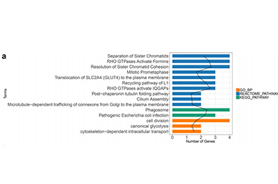 关键基因及功能富集分析结果:研究共获得33个上调和52个下调的与HCC进展和铁死亡相关的基因,这些基因显著参与负调控ERK1和ERK2级联反应、NAD生物合成过程、丙氨酸-天冬氨酸-谷氨酸代谢等。PPI 网络中有52个基因和78个相互作用,CDC20和HSPB1是关键枢纽基因。