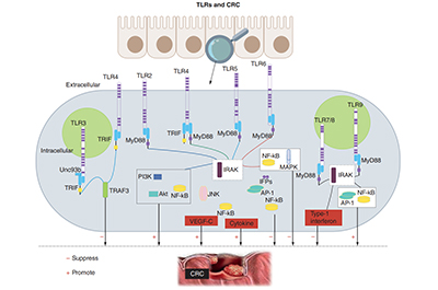 这项研究通过综合分析相关文献,探讨了toll样受体(TLRs)、肠道微生物群与结直肠癌(CRC)之间的关系,旨在为肿瘤免疫治疗和靶向治疗提供参考。