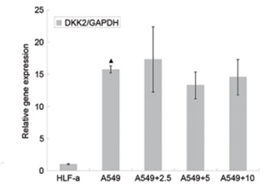 研究结果显示,左旋一叶萩碱能抑制A549肺癌细胞增殖,且呈剂量和时间依赖性,其24、36、48小时的半数抑制浓度分别为8.92、4.73 和 3.81µg/ml。同时,A549细胞中DKK1、DKK2和DKK3的表达显著高于HLF-a细胞,左旋一叶萩碱处理后,仅DKK1表达呈剂量依赖性下调。