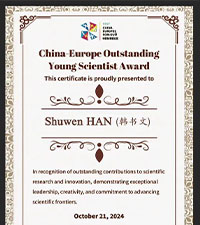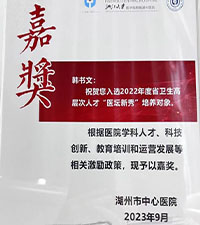 - 获奖荣誉(部分) 2021年 入选湖州市南太湖特支后备人才; 2021年 获浙江省科学技术进步奖三等奖; 2022年 入选浙江省卫健委551卫生“医坛新秀”; 2023年 获南太湖精英计划(科技创新领军人才) 2024年 获中欧十大杰出青年科学家奖